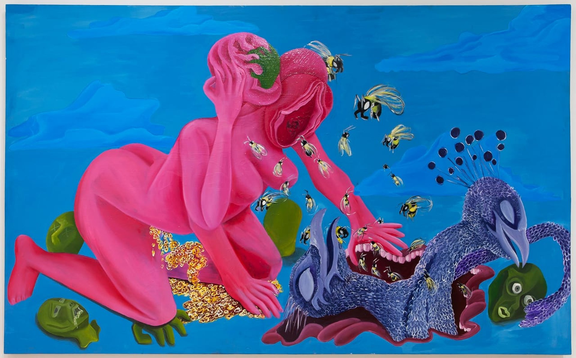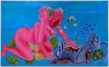 Influenced by Baroque painting, Japanese erotic art, and psychological anime, her vividly graphic compositions oscillate between beauty and discomfort. These imagined spaces function simultaneously as sites of refuge and confrontation—offering moments of solace to survivors while compelling viewers, particularly men, to reckon with the realities of sexual violence. Her human hybrid creatures, deliberately ambiguous in form, represent different phases of trauma, survival, and the emotional futility of revenge. Themes of violence, memory, redemption, and inherited trauma are central to her practice.