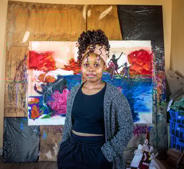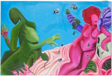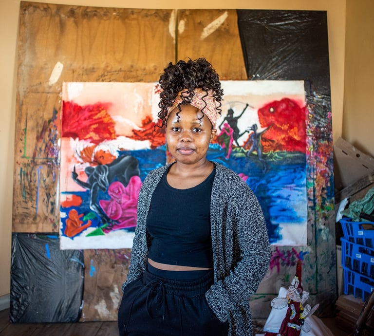Zama Mwandla (b. 2000, Newcastle, KwaZulu-Natal) is a South African surrealist painter whose bold, narrative-driven oil paintings confront the psychological aftermath of rape and the complex, non-linear journey toward healing. Drawing from her lived experience as a rape survivor, Mwandla constructs fantastical yet viscerally charged worlds populated by hybrid human figures that embody mental fracture, shame, desire, and the fragile process of recovery.